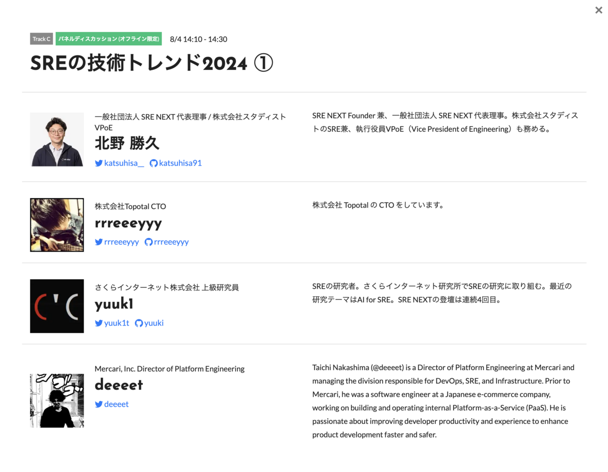 2023の振り返りブログと大きく変わっておらずですがSRE NEXTの発起人で、現在も引き続きSRE NEXTの運営母体である一般社団法人SRE NEXTの代表理事をしています。
