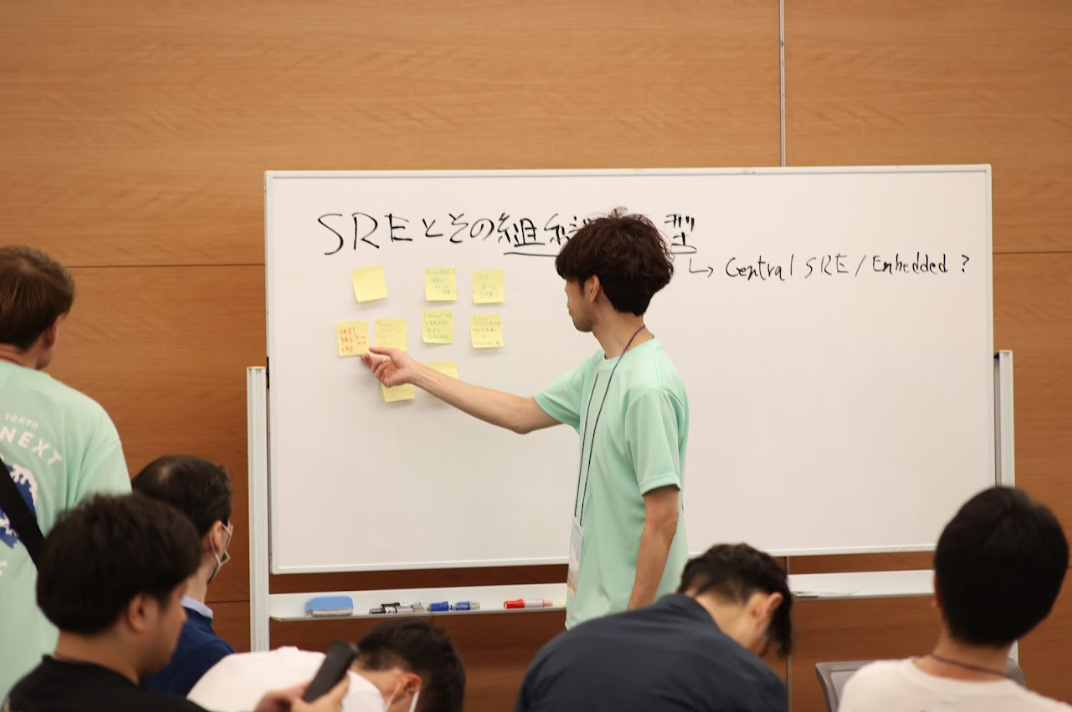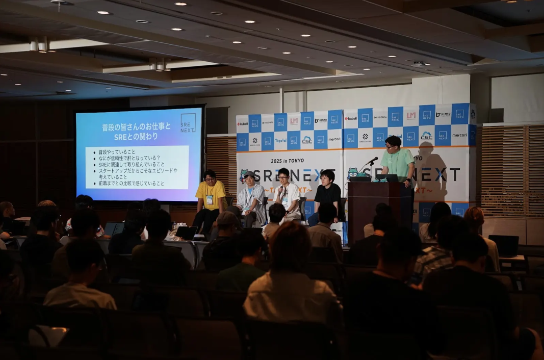 当日は主に受付でチケット関連のイレギュラー対応をしておりました + 今年もパネルディスカッションの司会として「スタートアップでのSRE実践」の進行をやりました。前述の写真は、その時のものです。