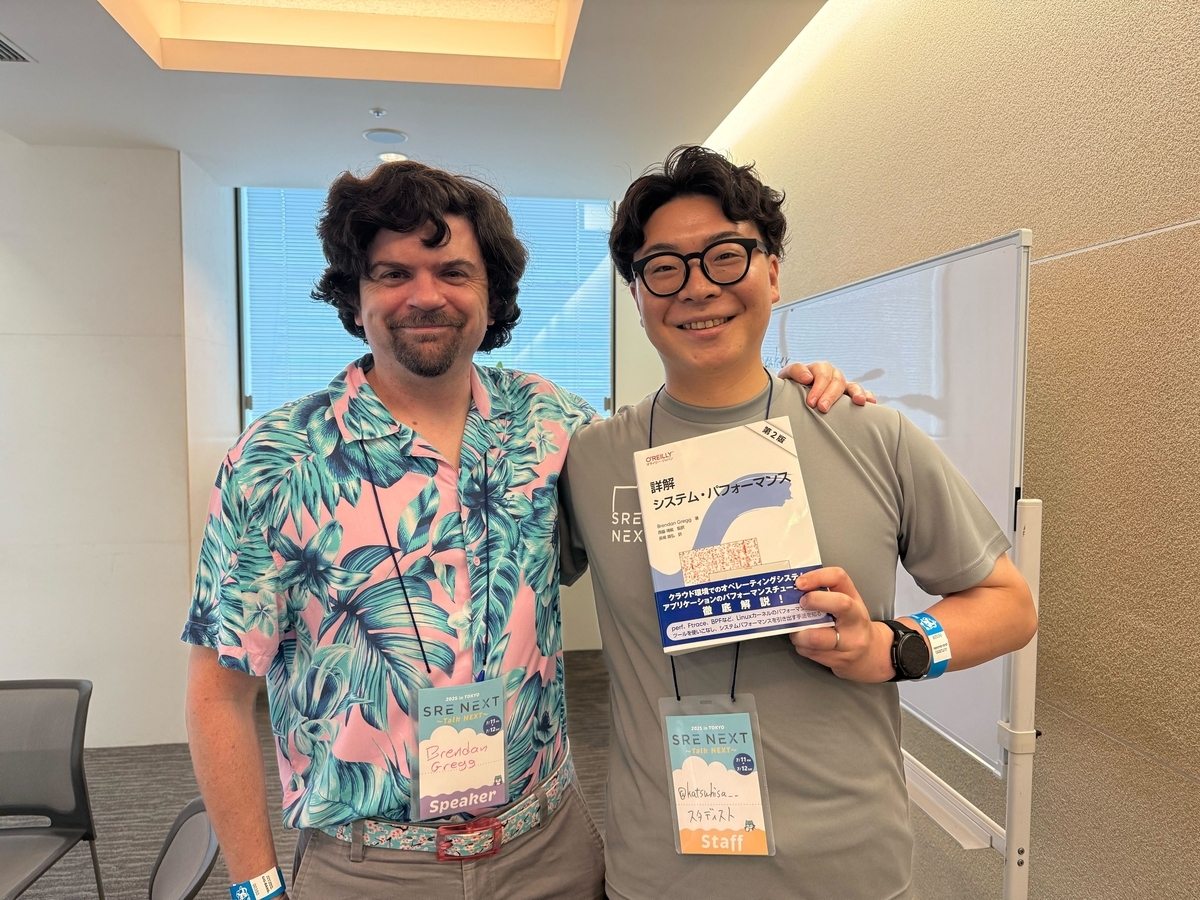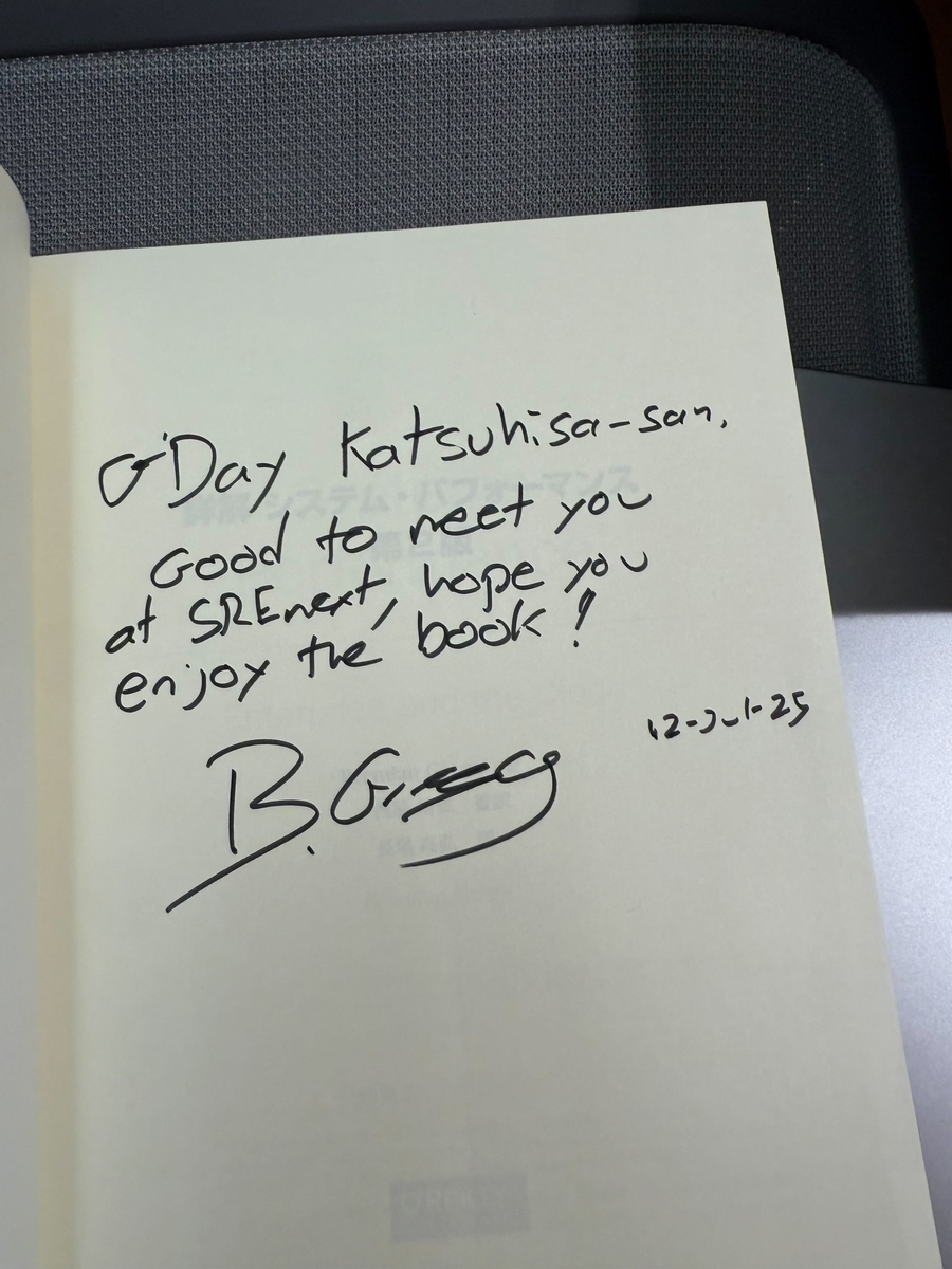 『詳解 システム・パフォーマンス 第2版』にBrendan Greggさんにいただいたサインと、一緒にとっていただいた写真